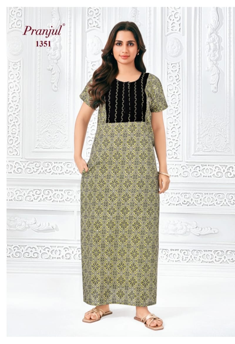 Pranjul nighties are?typically made from?pure, soft cotton?and are designed for comfort during sleep and casual wear. Common features include a?printed pattern, a?round neck, and half sleeves. Many models include a?side pocket?(sometimes with a specific compartment for a mobile phone) and have a full overlock stitching finish for durability.